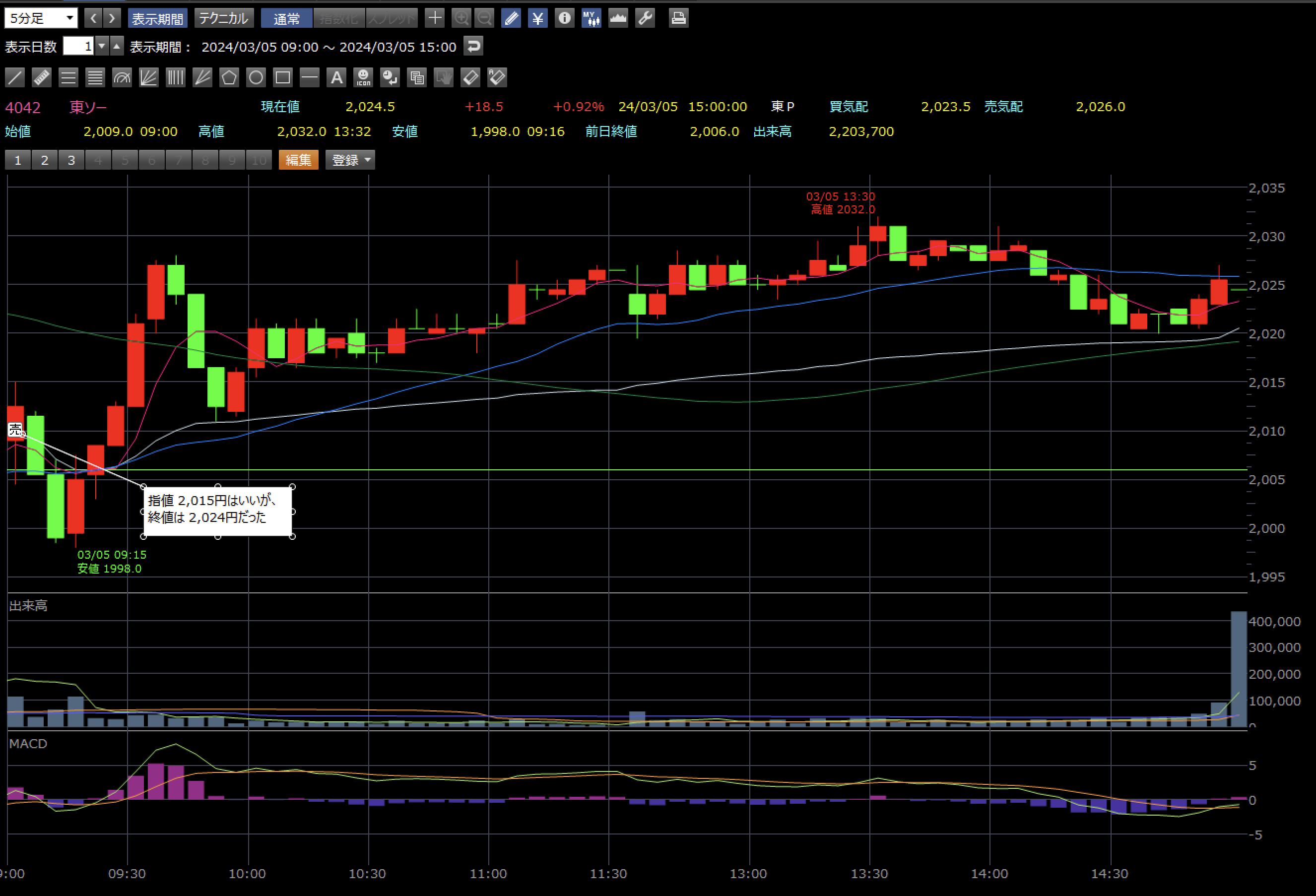 しかし、結果を見ると、株価が下がったのは9:15くらいまでで、その後は上昇をしていきました。終値は2045.5円なので、30円の含み損になるところでした。