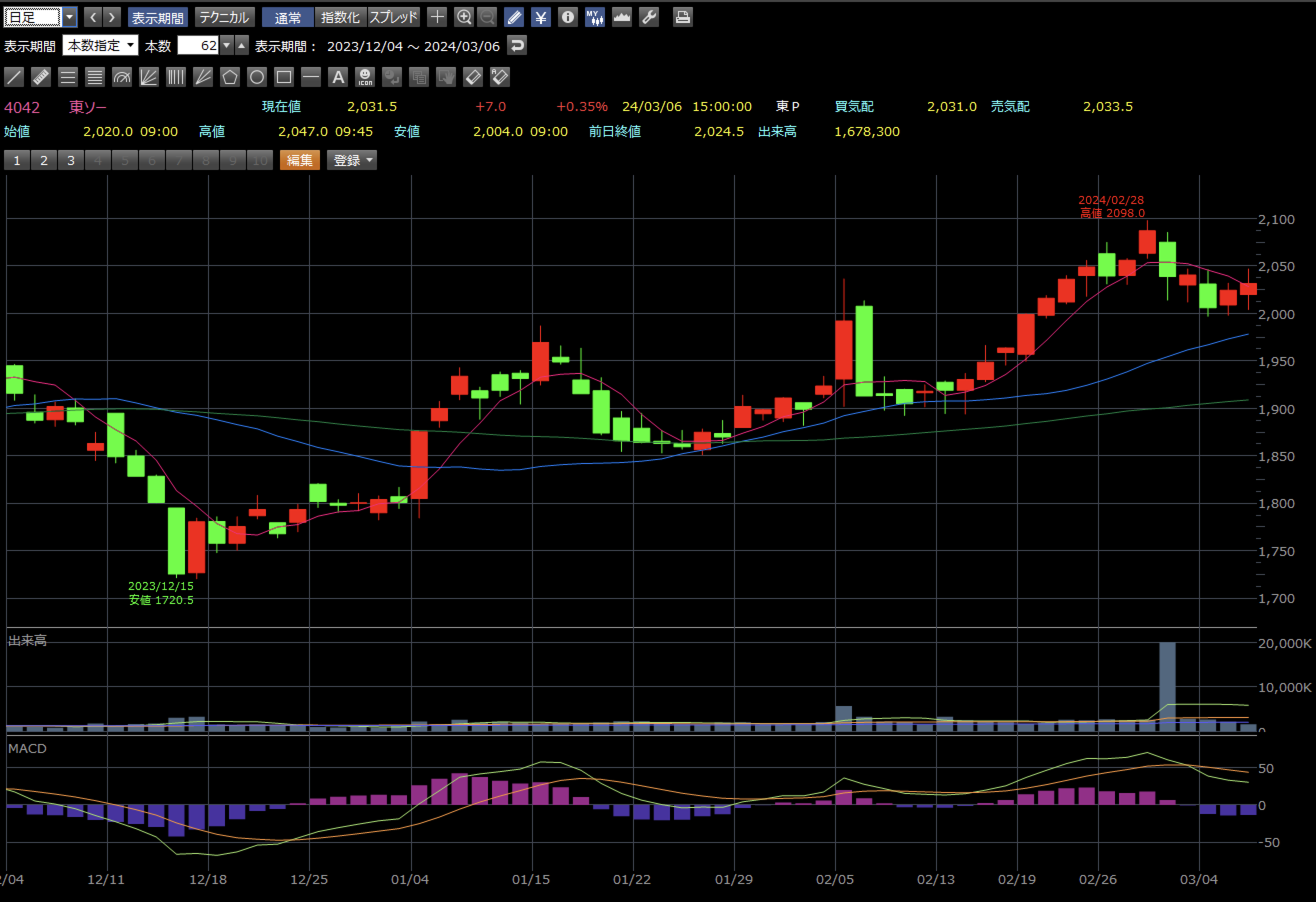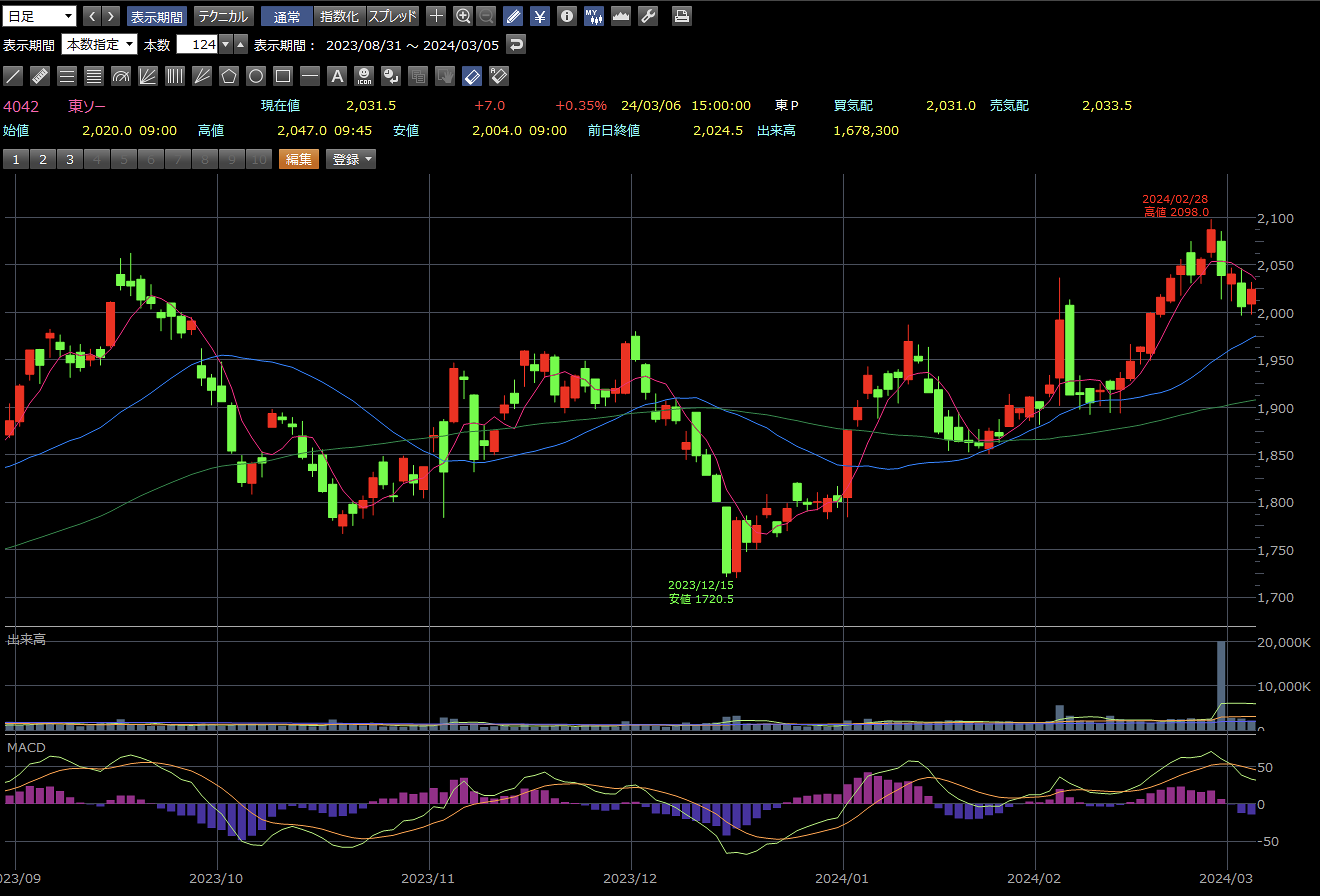 | 2024/03/08 | 東ソー | 4042 | 100 | 2,039.70 | 2057.50 | 1,780 |