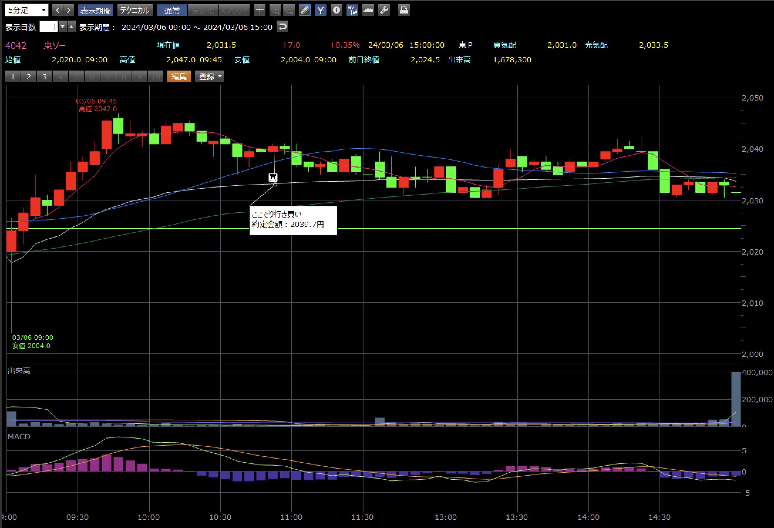 本日は予想練習のみにするつもりだったのですが、予想していた東ソー(4042)に押し目が出たように見えたので、成り行きで100株買ってみました。約定金額は2039.7円です。