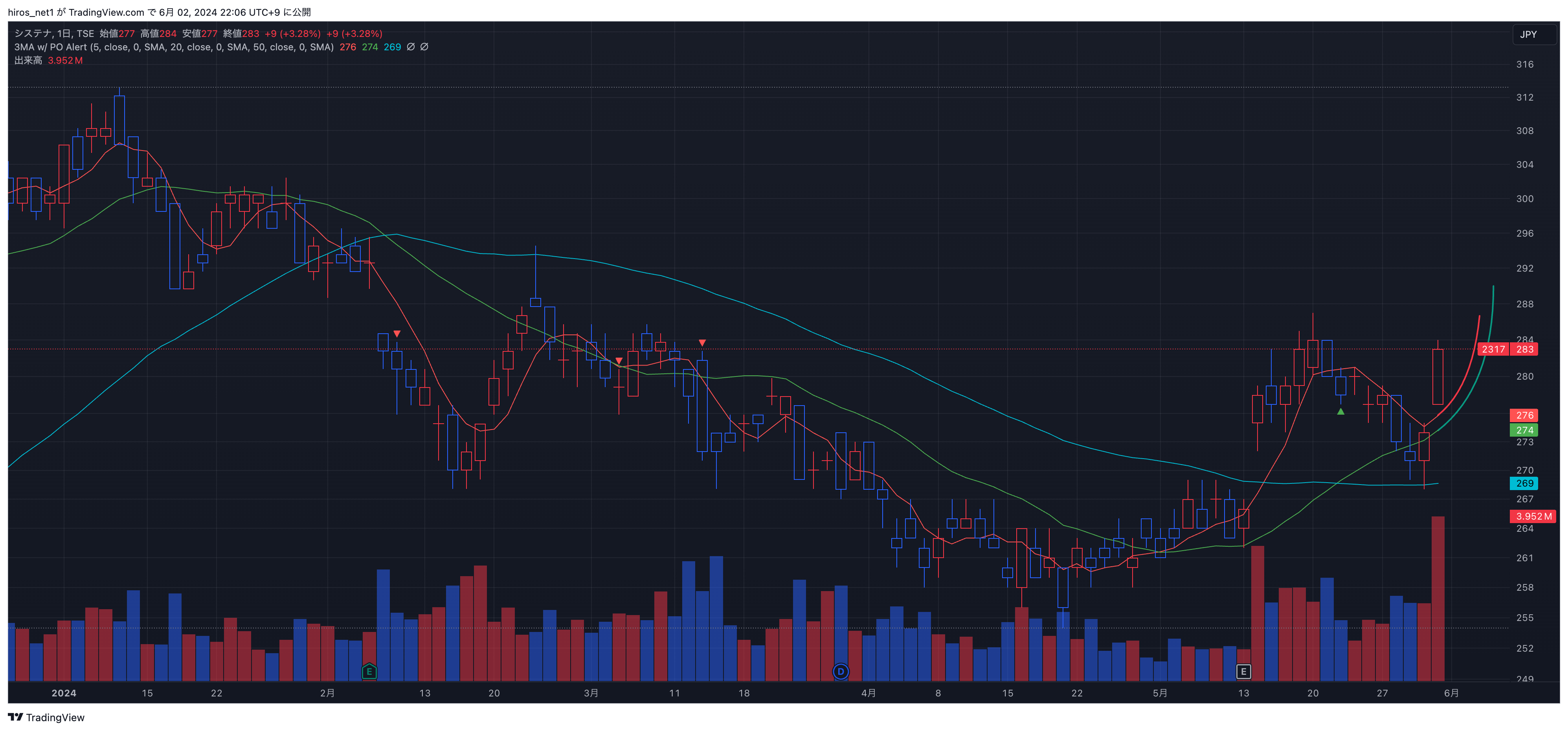 | 2024/06/03 | システナ | 2317 | 現物買い | 500 | 285.0 | – | – |