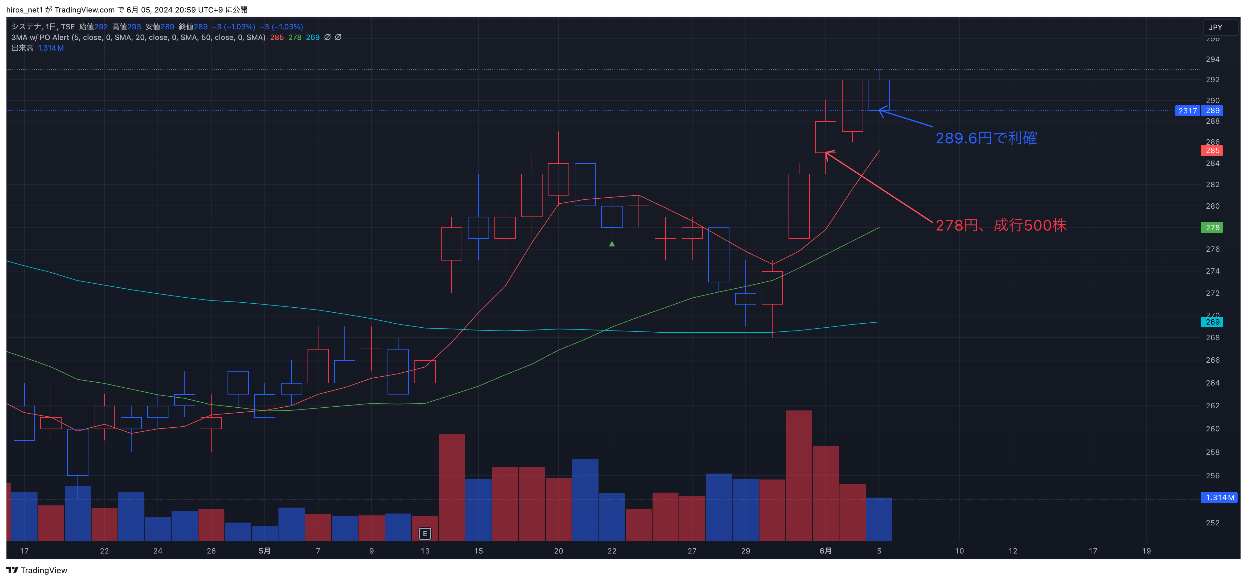 5/31に押し目が発生したので、6/3に成行で500株を購入しました。